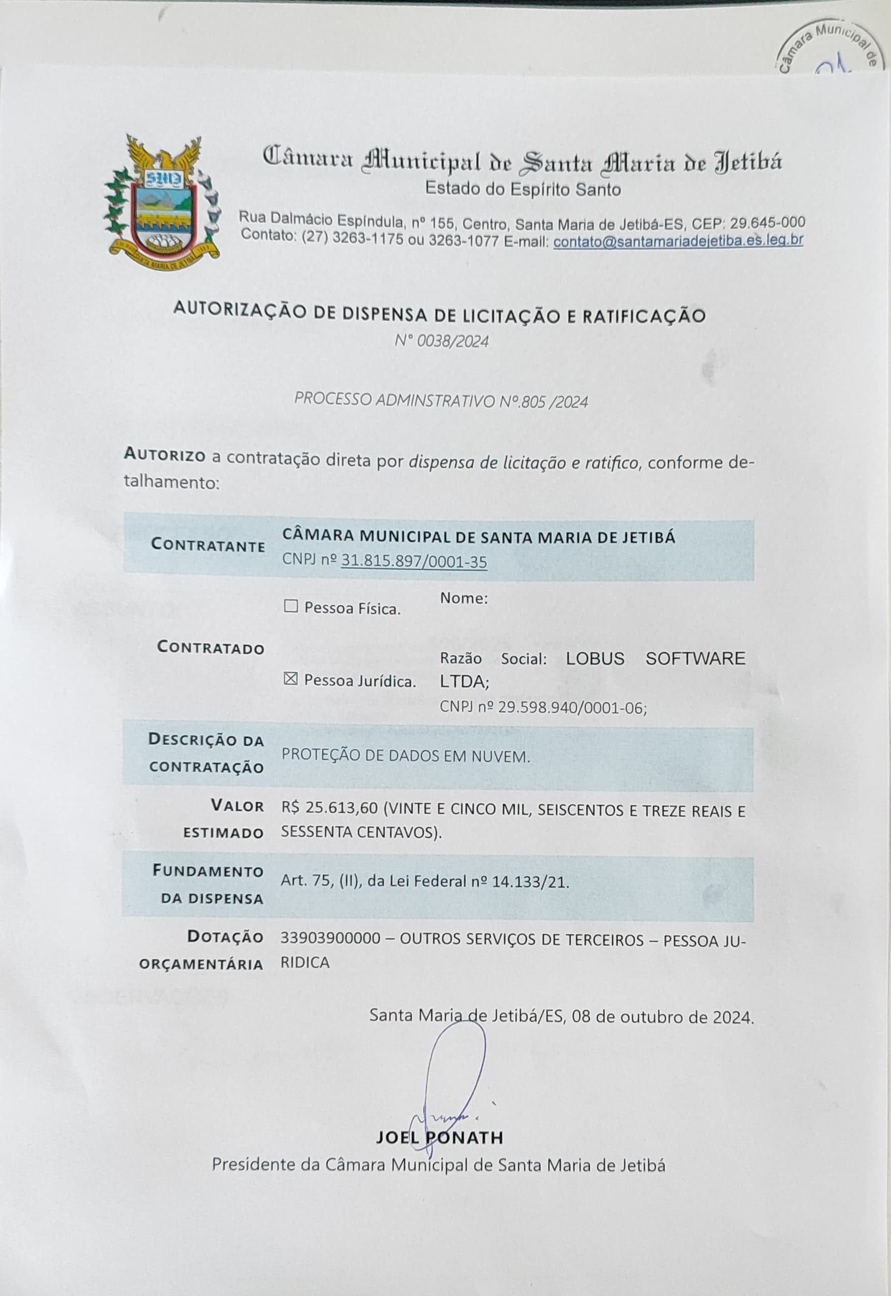 DISPENSA DE LICITAÇÃO 038-2024 - PROTEÇÃO DE DADOS EM NUVEM